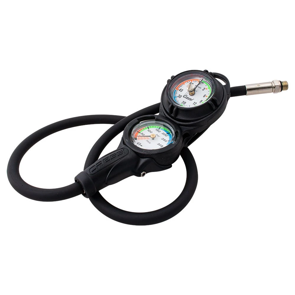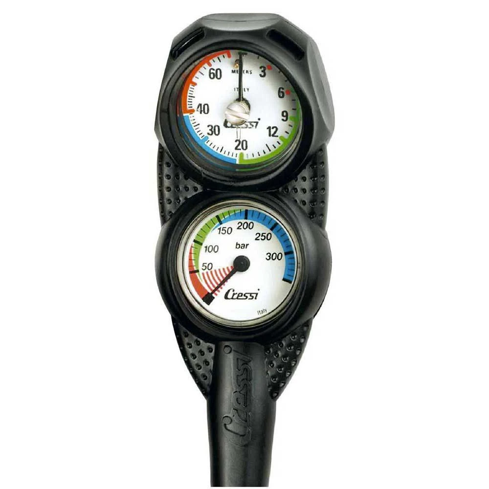 Mini Console 2 est une console aux dimensions réduites qui reçoit le mini manomètre Cressi et un nouveau petit profondimètre analogique.Il s’agit d’un instrument de haute qualité, doté d’un boîtier métallique et d’un capteur à membrane, offrant une large échelle de lecture.Sur le cadrant luminescent les 12 premiers mètres, qui correspondent à la zone des paliers de décompression, sont bien séparés et parfaitement lisibles.
