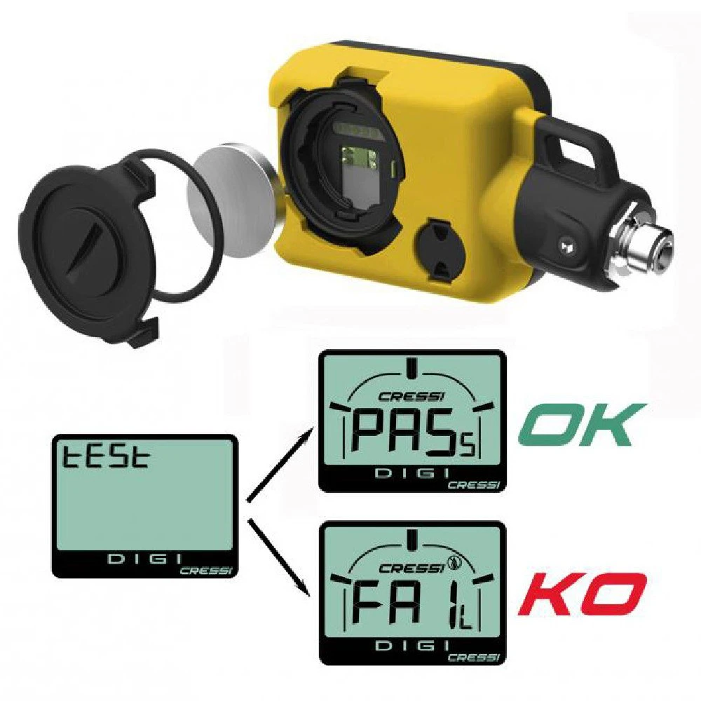 Remplacement de la batterie par l’utilisateur sans avoir besoin d’outils. Autotest d’étanchéité (breveté). Le cache batterie a été spécialement conçu pour éviter les incidents grâce à deux clips de maintien et pour proposer des pièces facilement remplaçables (O ring). Après avoir changé la pile, DIGI 2 effectue un autotest de pressurisation pour s’assurer qu’il a été effectué correctement.