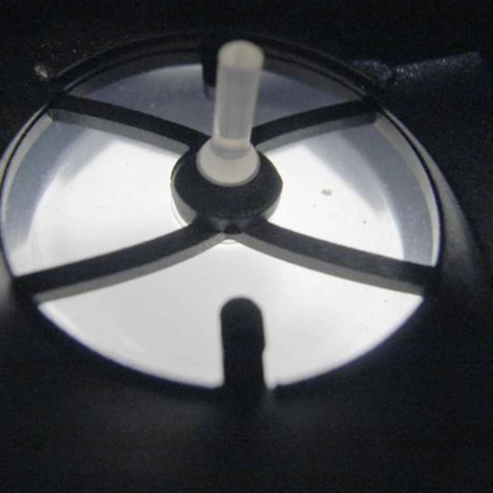 Perçage asymétrique du capuchon frontal. Le débit d’eau commence à pousser le diaphragme dans le sens anti-horaire pour créer sa rétraction parfaitement à plat et faire diminuer progressivement le levier en perpendicularité précise, quelles que soient les conditions (débit, mouvements brusques, toute position du visage…).