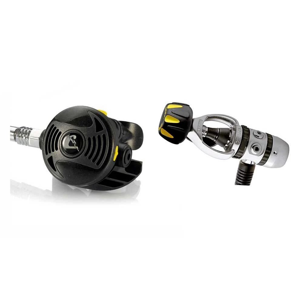 des instruments pour un plus grand confort en plongée. Puissant filtre conique interne, plus efficace de 200 % par rapport à un filtre plat normal.. Debit dair de 2.100 litres/minute grâce aux nouveaux passages plus larges. Fixations à étrier et DIN 2ème étage Déviateur de flux, qui utilise
