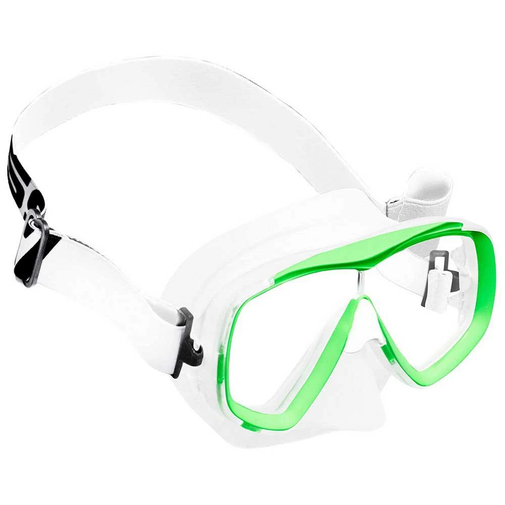 Cette nouvelle version de l’Estrella dispose d’une sangle en tissu élastiqué sans boucles de réglage pour faciliter l’enfilage des enfants et éviter de se tirer les cheveux. Le clip de tuba traditionnel a été remplacé par une boucle créée avec la sangle en tissu soutenant et positionnant le tuba. Le même masque peut être équipé à la fois des sangles en silicone et en tissu via une broche de fixation.