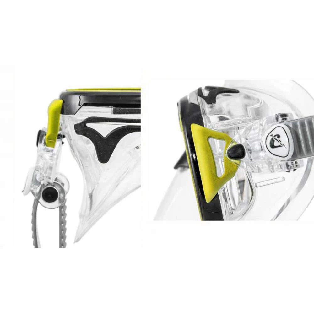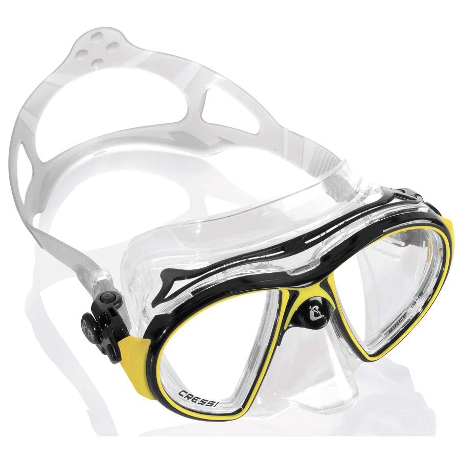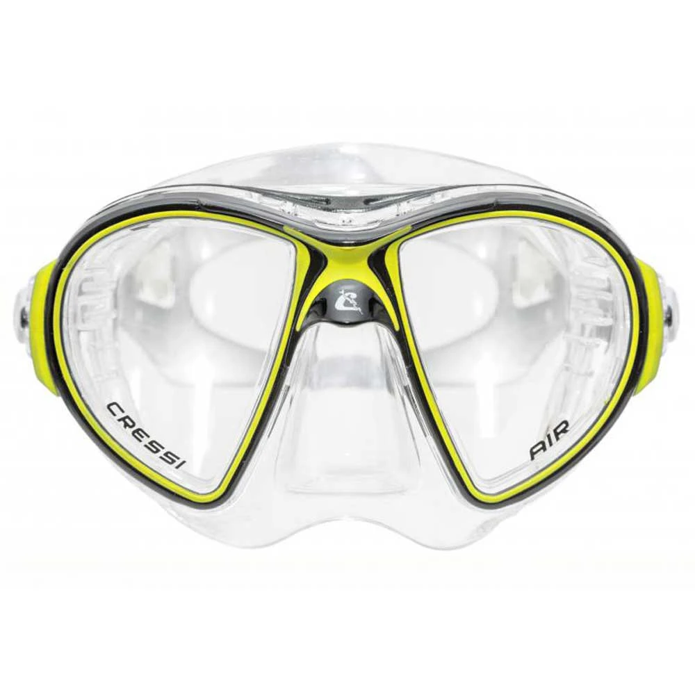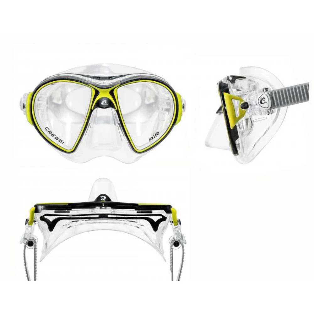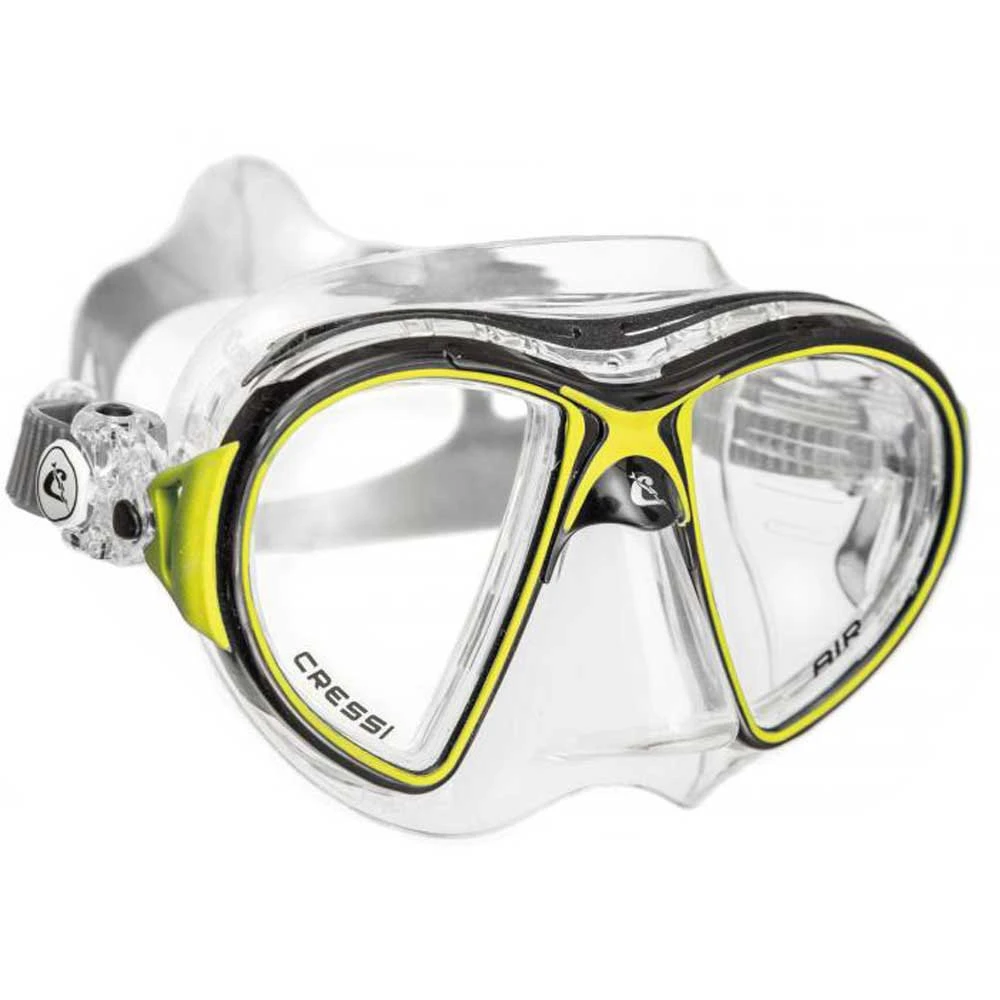 Le profil hydrodynamique avancé de l’ Air Crystal est un sous-produit du brevet du système de technologie à double trame intégrée de Cressi, intégrant la jupe en silicone au cadre de la lentille. Cela se traduit par une épaisseur globale réduite et un champ de vision accru . Une paire de lunettes Big Eyes offre une visibilité illimitée inférieure et latérale.
