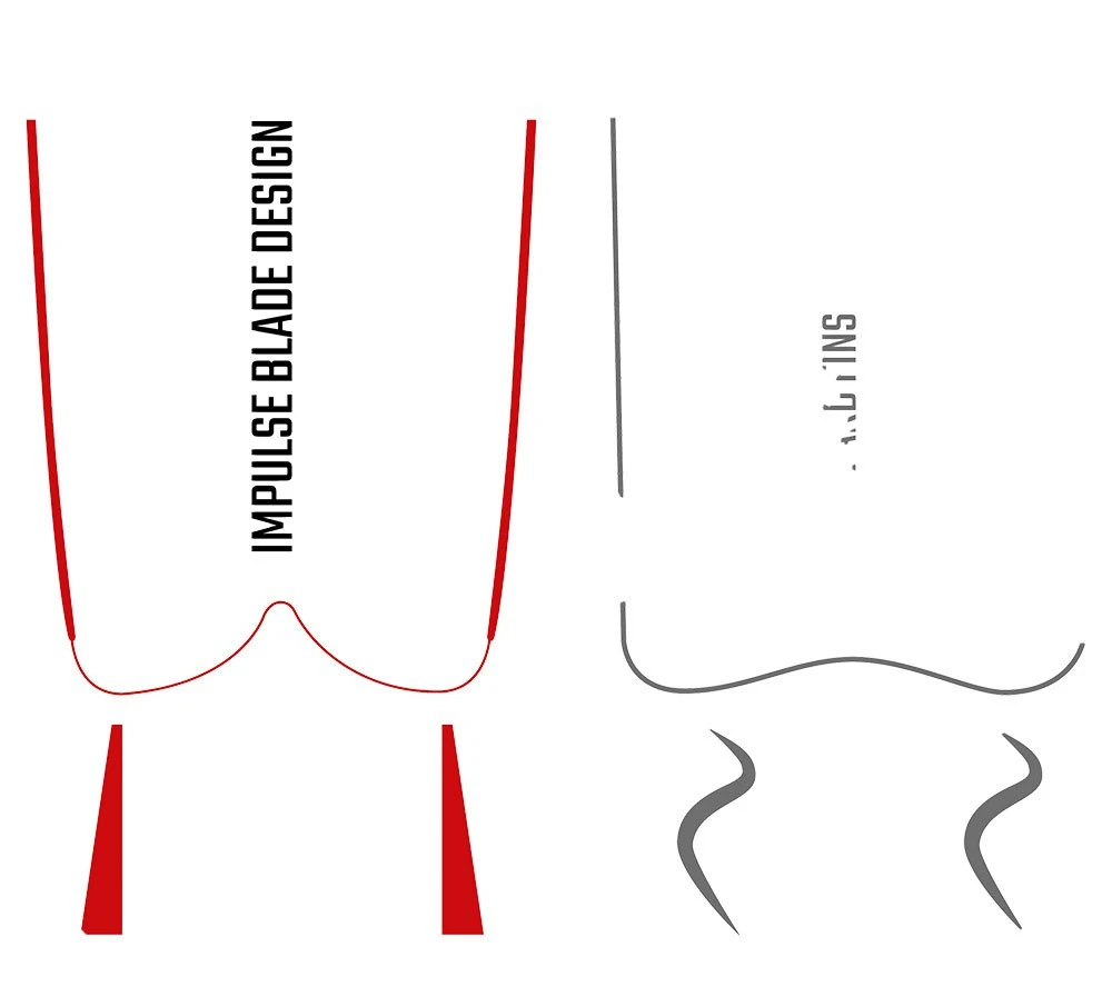 Le design du bout de la lame est légèrement conique et intègre deux spoilers en subtil caoutchouc thermoplastique. Cette caractéristique, associée à la progression calculée de l’arc de flexion de la lame, rend la stabilité de battement d’Impulse parfaite.
